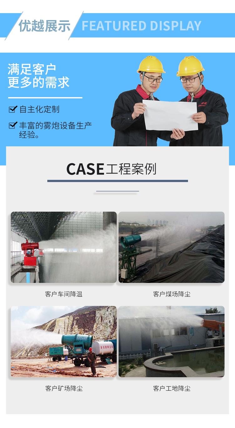 主要用途:適用于城市拆遷工地、冶金鋼鐵企業(yè)、采礦區(qū)域、煤化工企業(yè)、水泥廠、火力發(fā)電廠、建筑工地、物料和礦產(chǎn)品露天堆放廠、混凝土處理廠、垃圾堆放場(chǎng)、垃圾焚燒廠、沙廠、干式物料倉(cāng)庫(kù)、露天爆破、重度粉塵區(qū)域。
