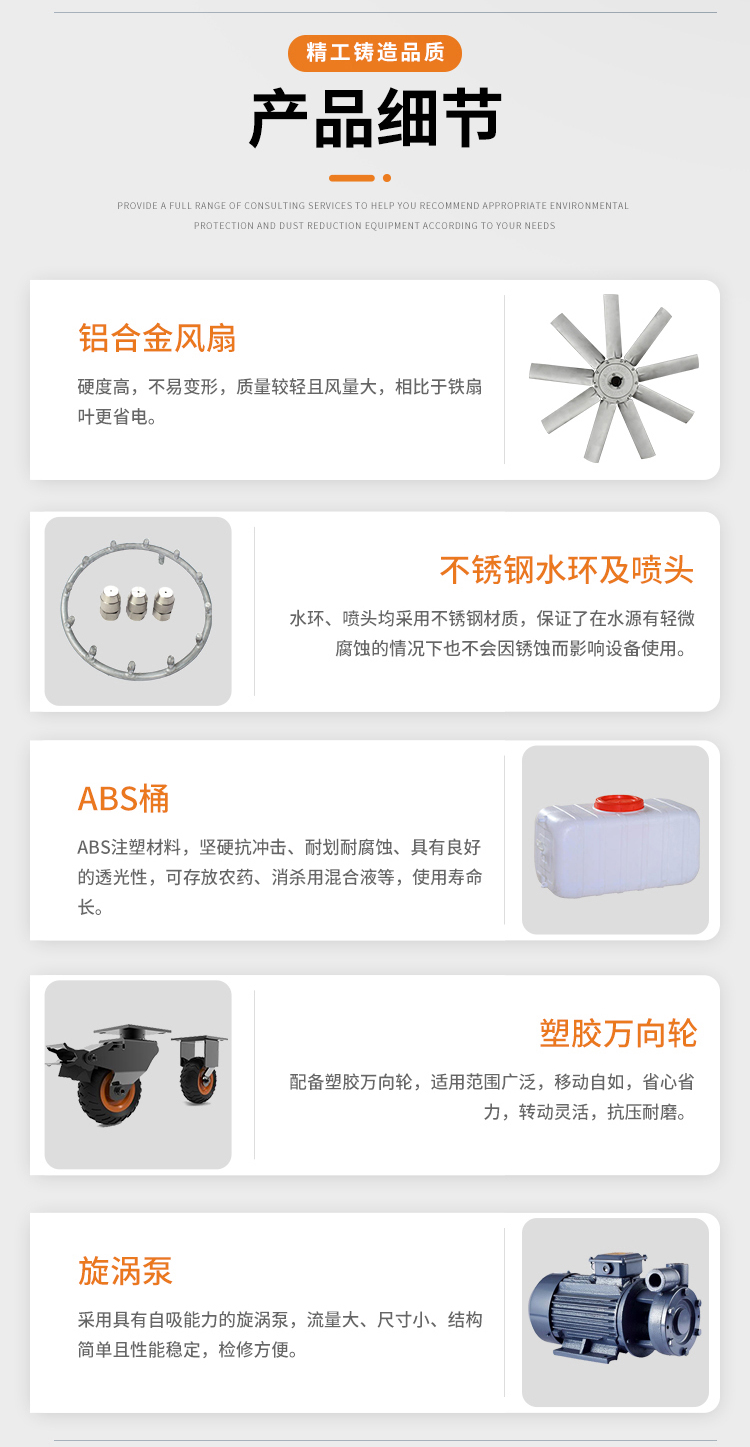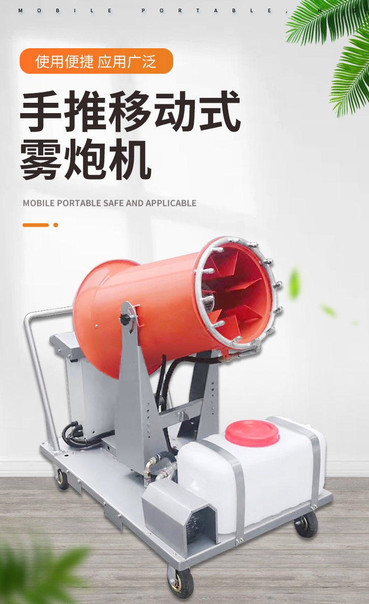 產品特點:手推移動式霧炮機降塵速度快、機結構緊湊、布局合理、移動靈活、構造簡單易維護。