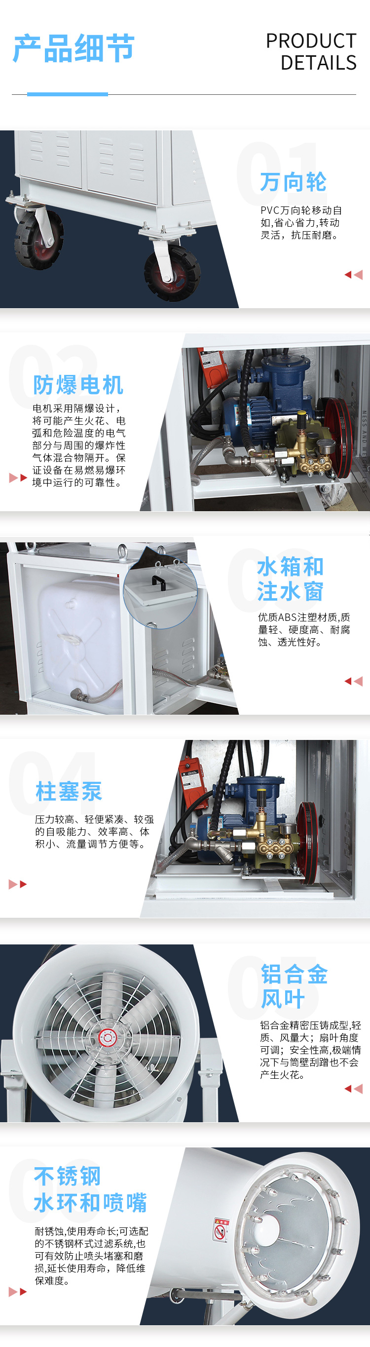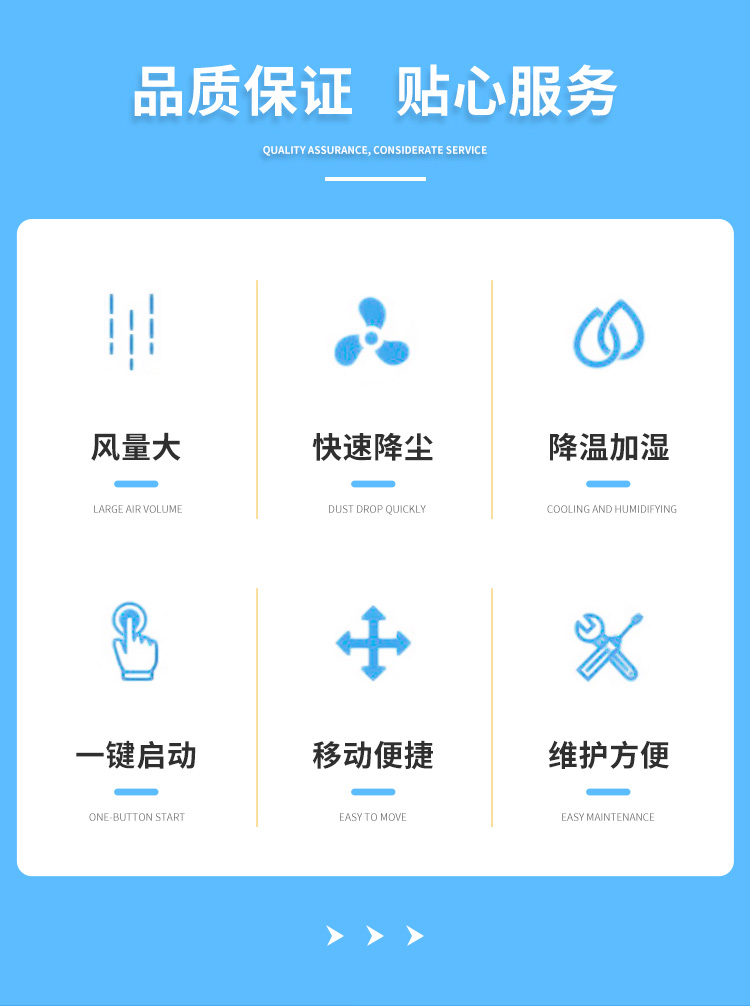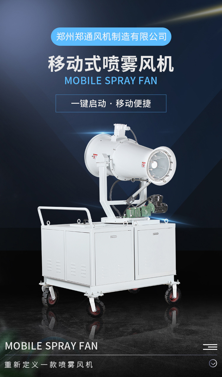 產品特點:移動式噴霧風機這款產品具有一鍵啟動功能,能起到快速降塵、降溫的作用;移動便捷,方便維修。