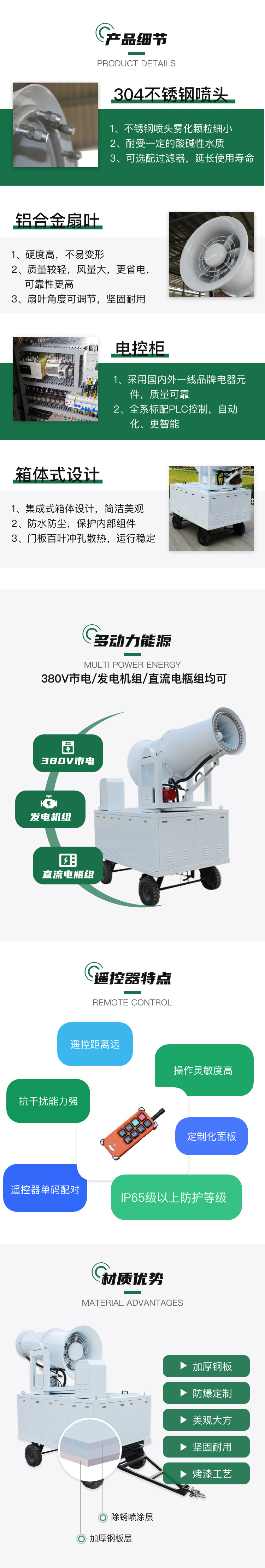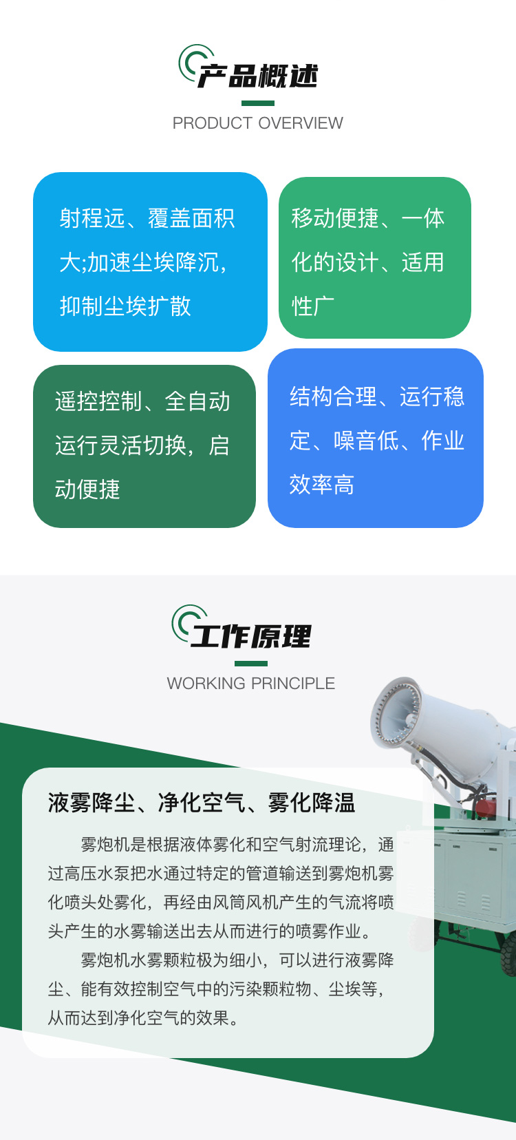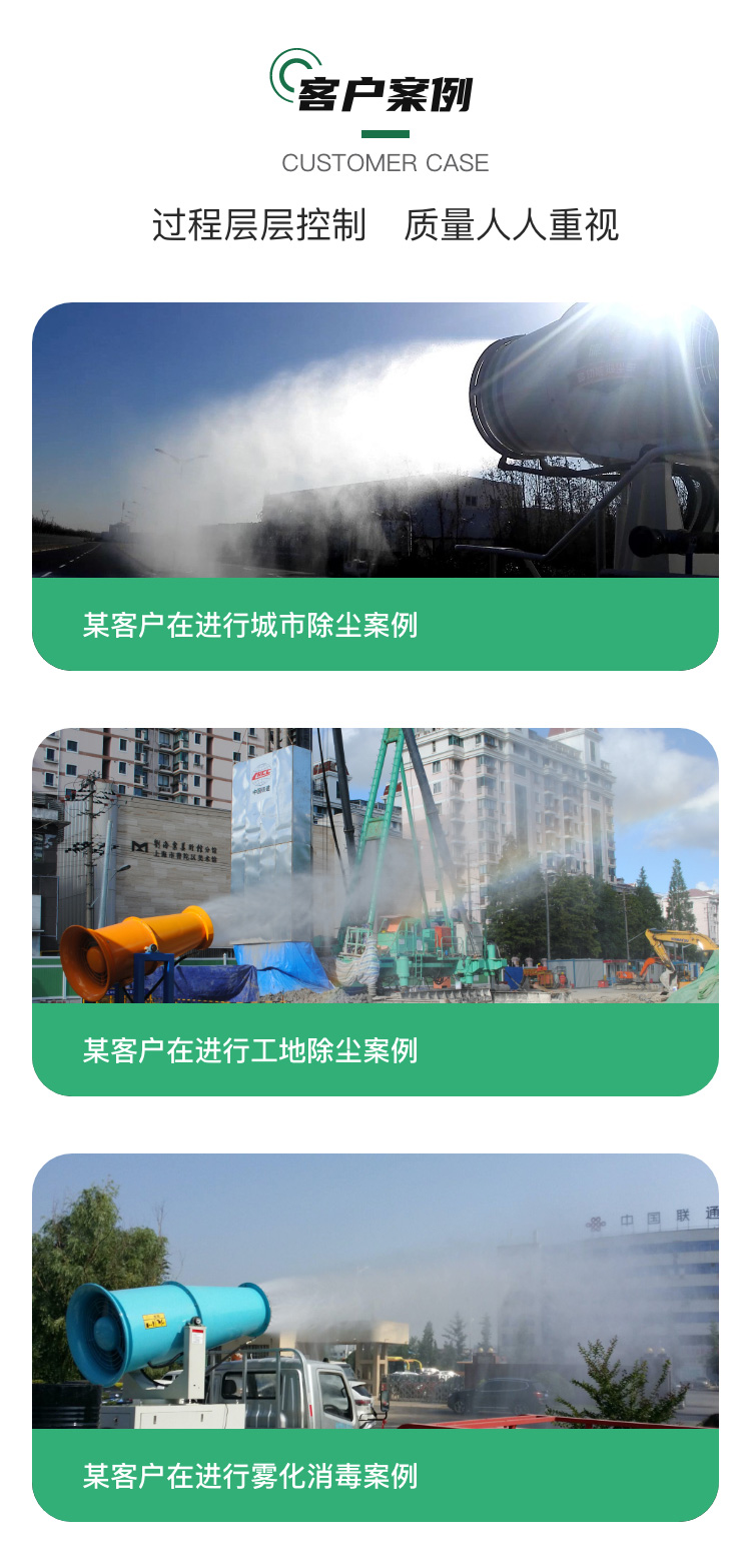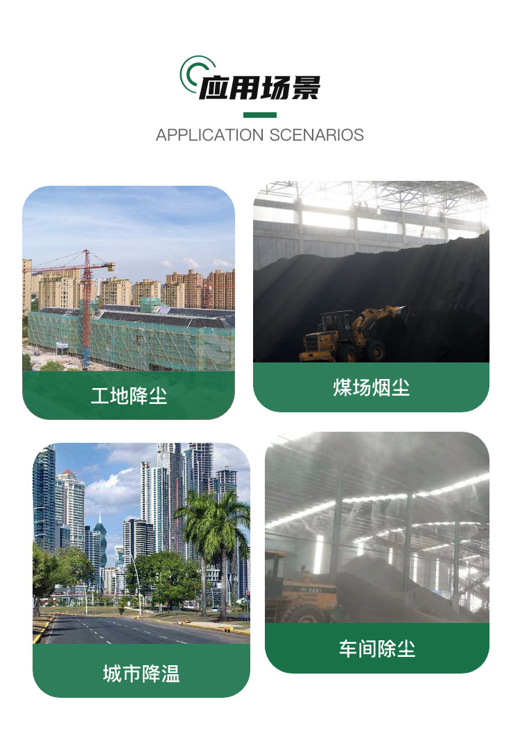 主要用途:移動方便、射程遠、覆蓋范圍廣、可以實現精量噴霧;工作效率高、噴霧速度快;使用安全可靠,遙控和人工控制操作,可隨意控制調節水平旋轉噴霧角度;耗水量相比其它抑塵噴灑設備可節約70%~80%(噴槍、灑水機車),且水霧覆蓋粉塵面積遠遠大于其它抑塵噴灑設備。