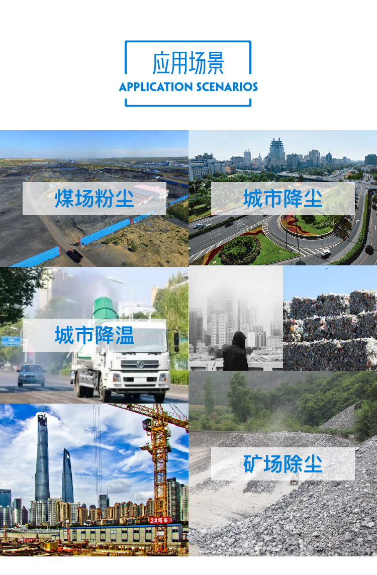 主要用途:用于煤礦場、城市拆遷工地、冶金鋼鐵企業(yè)、采礦區(qū)域、煤化工企業(yè)、水泥廠、火力發(fā)電廠、物料和礦產(chǎn)品露天堆放廠、混凝土處理廠、垃圾堆放場、垃圾焚燒廠、沙廠、干式物料倉庫、露天爆破、重度粉塵區(qū)域。