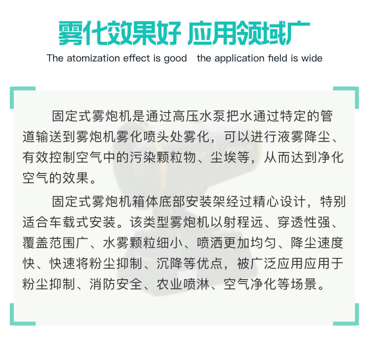 產(chǎn)品特點:100米全自動霧炮機射程遠、覆蓋范圍廣、工作效率高、可以實現(xiàn)精量噴霧;配套動力靈活,使用安全可靠。