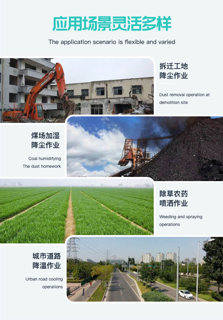 主要用途:用于煤礦場、城市拆遷工地、冶金鋼鐵企業(yè)、采礦區(qū)域、煤化工企業(yè)、水泥廠、火力發(fā)電廠、物料和礦產(chǎn)品露天堆放廠、混凝土處理廠、垃圾堆放場、垃圾焚燒廠、沙廠、干式物料倉庫、露天爆破、重度粉塵區(qū)域。