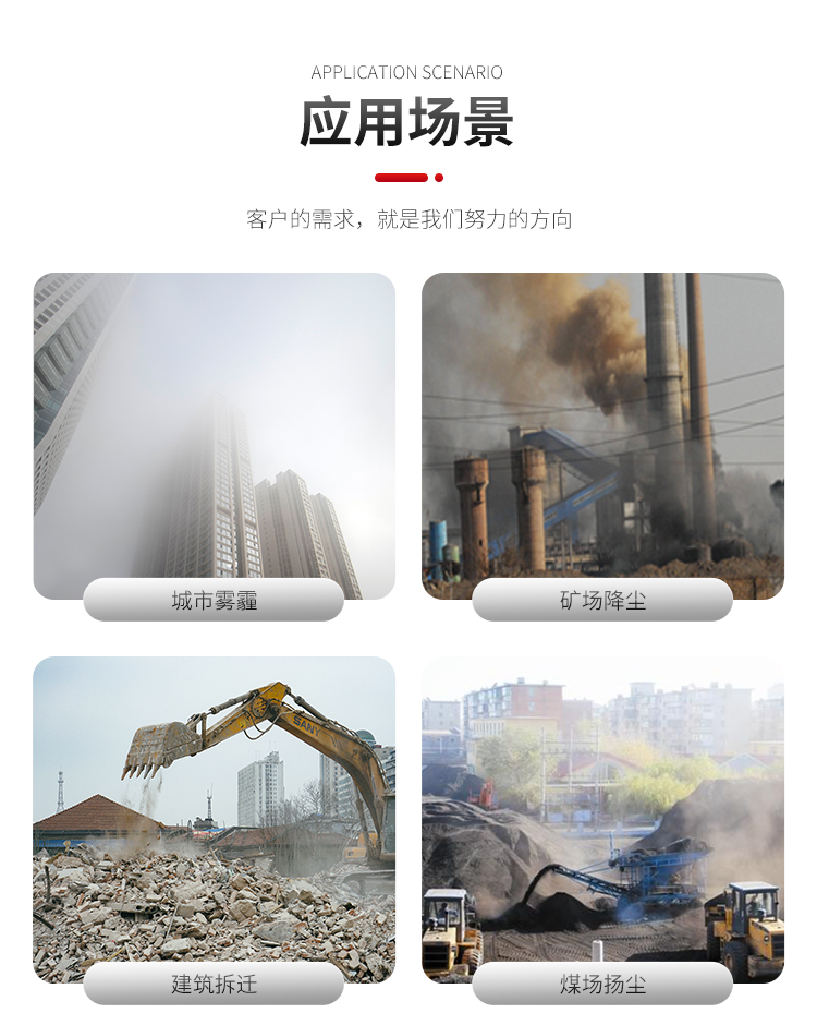 主要用途:用于城市拆遷工地、冶金鋼鐵企業(yè)、采礦區(qū)域、煤化工企業(yè)、水泥廠、火力發(fā)電廠、建筑工地、物料和礦產(chǎn)品露天堆放廠、混凝土處理廠、垃圾堆放場、垃圾焚燒廠、沙廠、干式物料倉庫、露天爆破、重度粉塵區(qū)域。