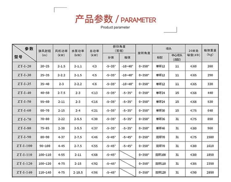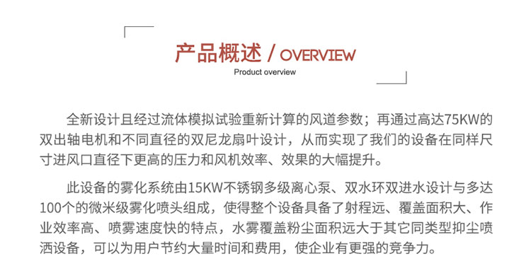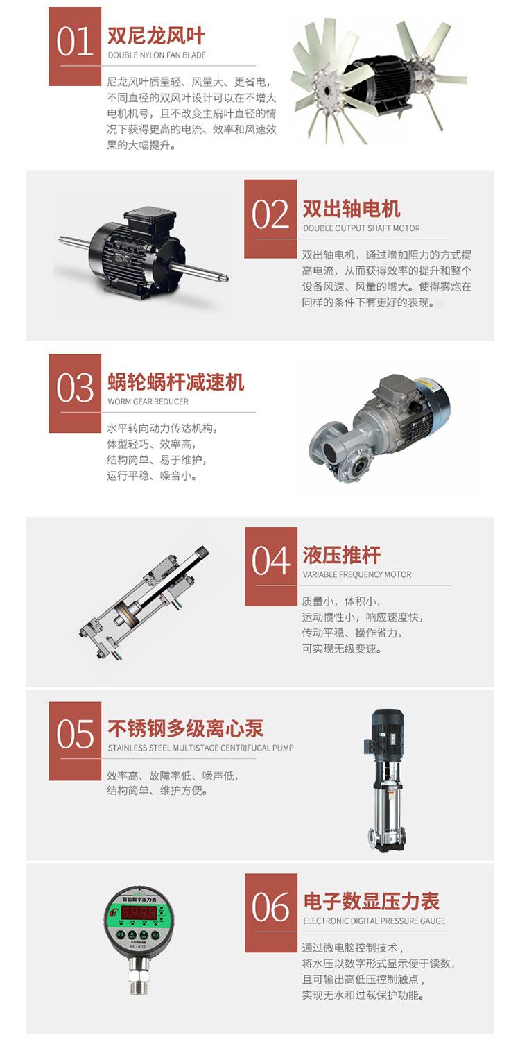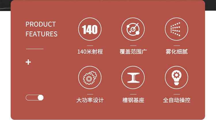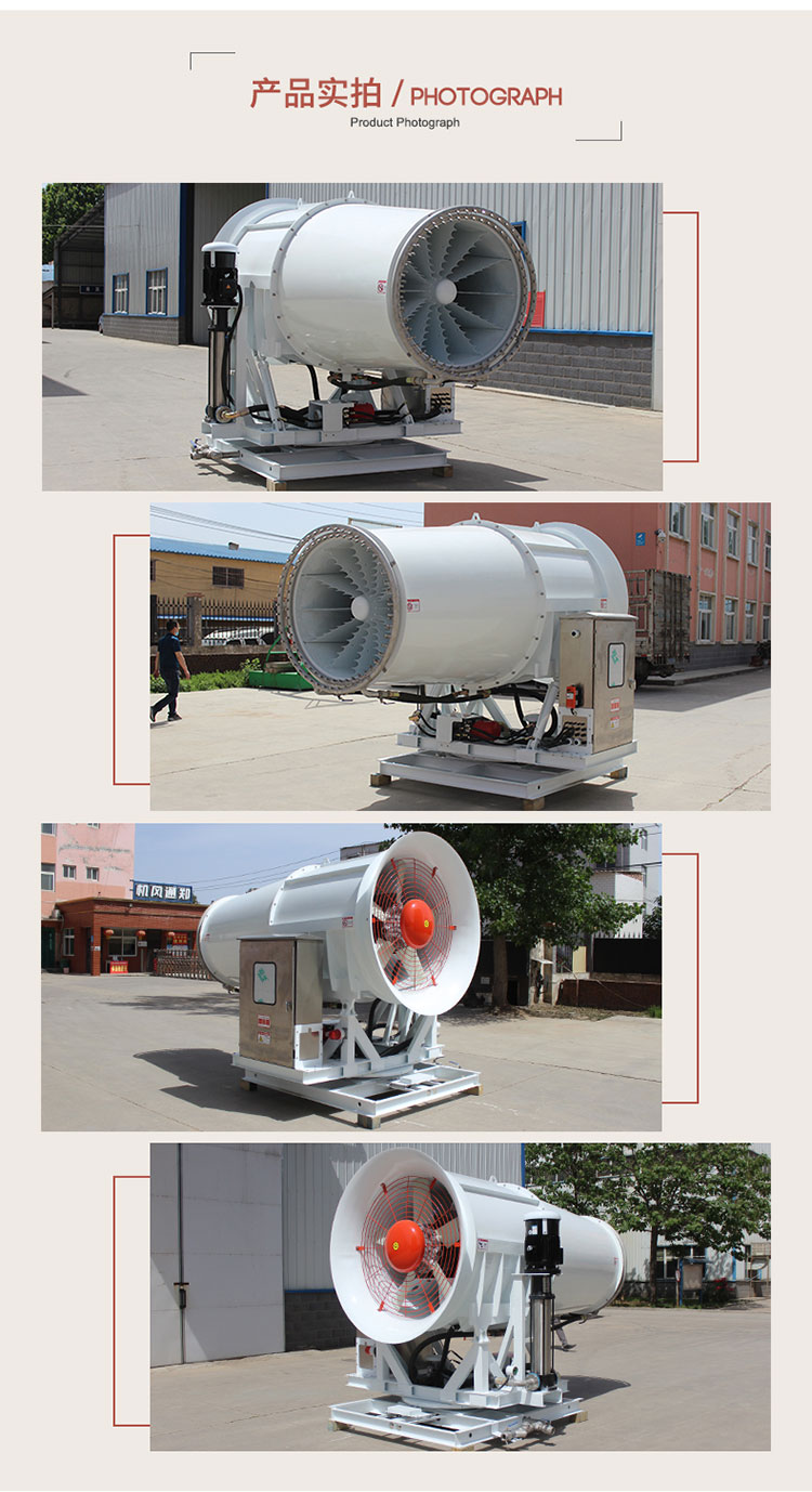產品特點:140米遠程霧炮機的霧化系統由15KW不銹鋼多級離心泵、雙水環雙進水設計與多達100個的微米級霧化噴頭組成,使得整個設備具備了射程遠、覆蓋面積大、作業效率高、噴霧速度快的特點,水霧覆蓋粉塵面積遠大于其它同類型抑塵噴灑設備,可以為用戶節約大量時間和費用,使企業有更強的競爭力。