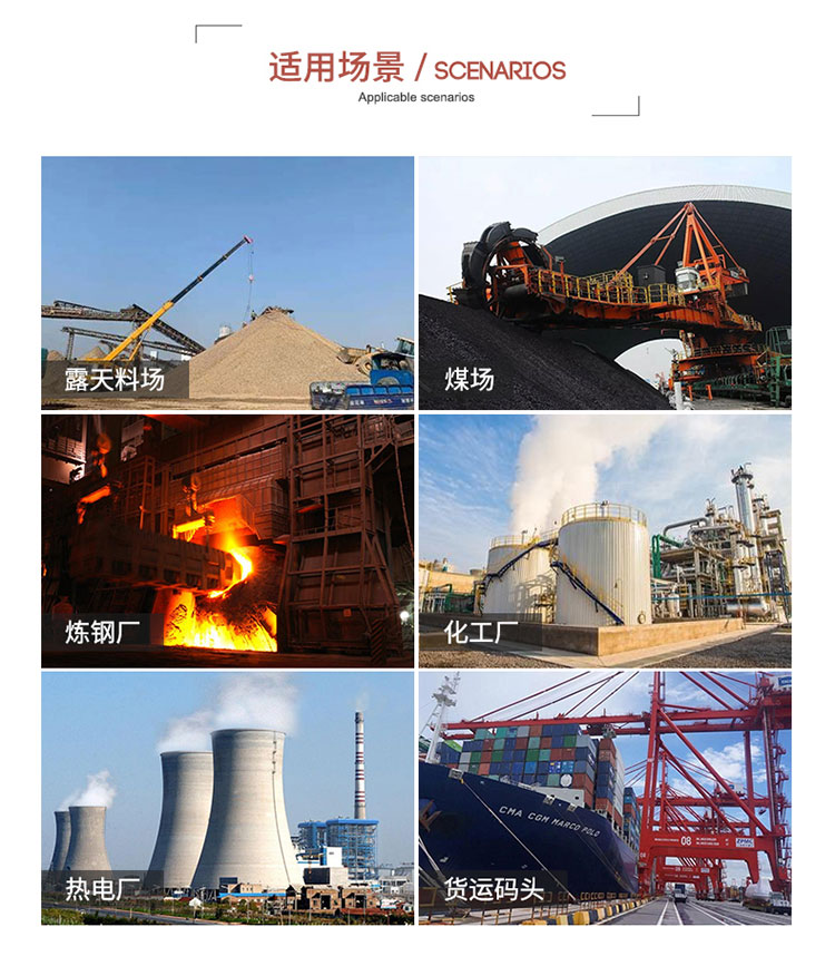 主要用途:用于煤礦場地、冶金鋼鐵企業、采礦區域、煤化工企業、水泥廠、火力發電廠、建筑工地、物料和礦產品露天堆放廠、混凝土處理廠、垃圾堆放場、垃圾焚燒廠、沙廠、干式物料倉庫、露天爆破、重度粉塵區域。