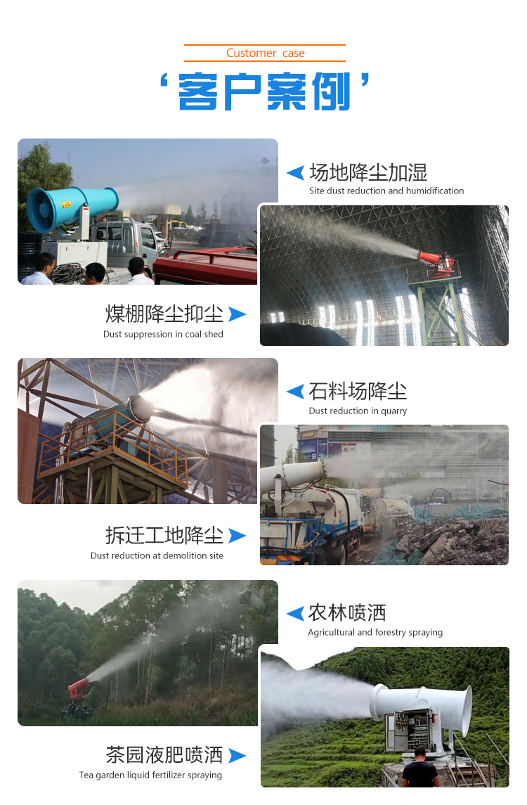 主要用途:用于煤礦場、城市拆遷工地、冶金鋼鐵企業(yè)、采礦區(qū)域、煤化工企業(yè)、水泥廠、火力發(fā)電廠、物料和礦產(chǎn)品露天堆放廠、混凝土處理廠、垃圾堆放場、垃圾焚燒廠、沙廠、干式物料倉庫、露天爆破、重度粉塵區(qū)域。