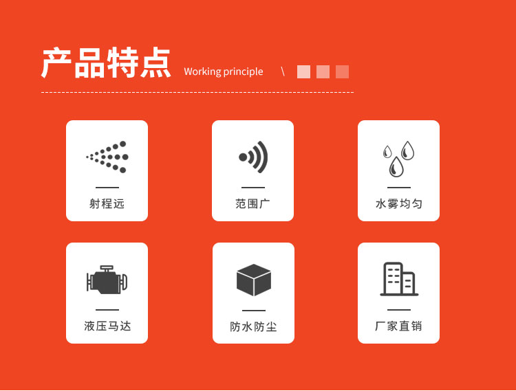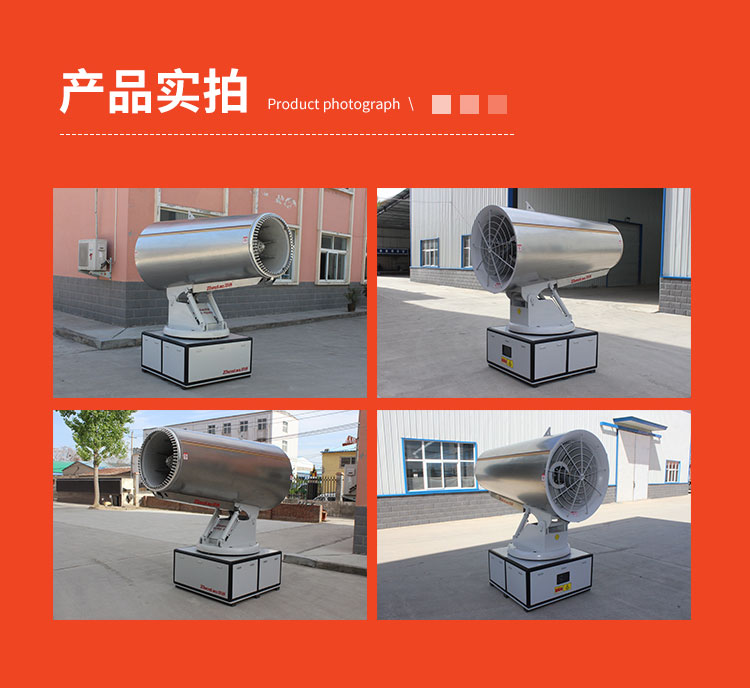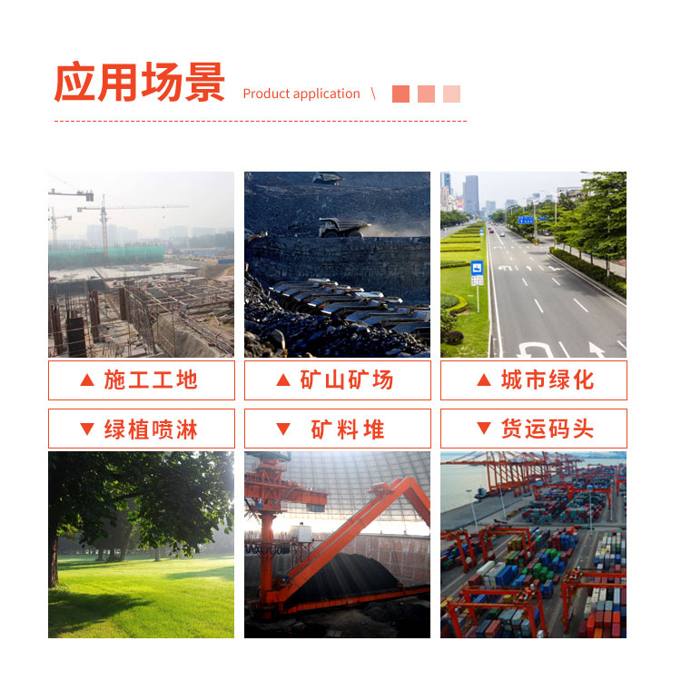 主要用途:用于煤礦場、城市拆遷工地、冶金鋼鐵企業、采礦區域、煤化工企業、水泥廠、火力發電廠、物料和礦產品露天堆放廠、混凝土處理廠、垃圾堆放場、垃圾焚燒廠、沙廠、干式物料倉庫、露天爆破、重度粉塵區域。