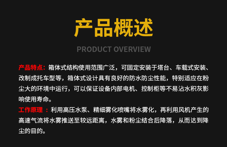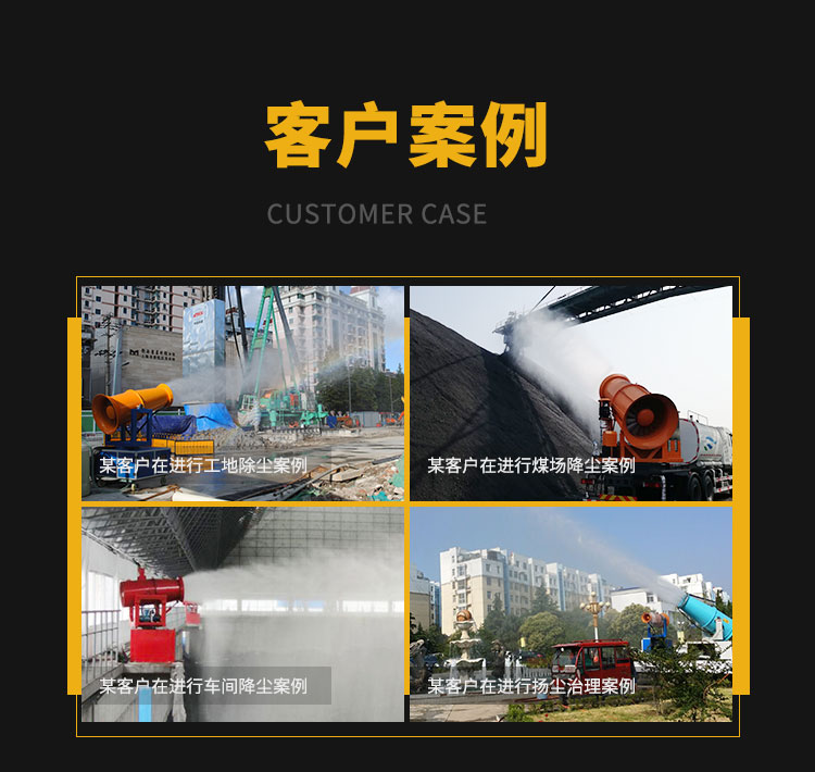 主要用途:適用于城市拆遷工地、冶金鋼鐵企業、采礦區域、煤化工企業、水泥廠、火力發電廠、建筑工地、物料和礦產品露天堆放廠、混凝土處理廠、垃圾堆放場、垃圾焚燒廠、沙廠、干式物料倉庫、露天爆破、重度粉塵區域。