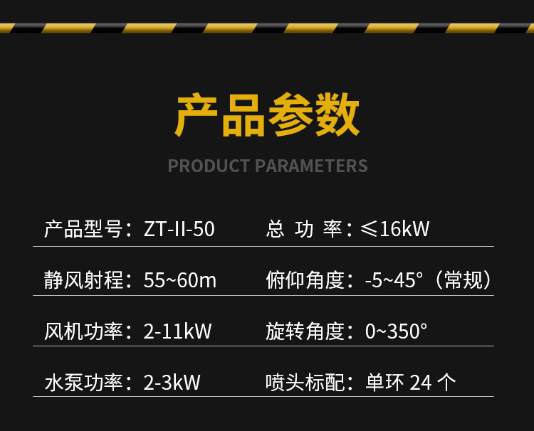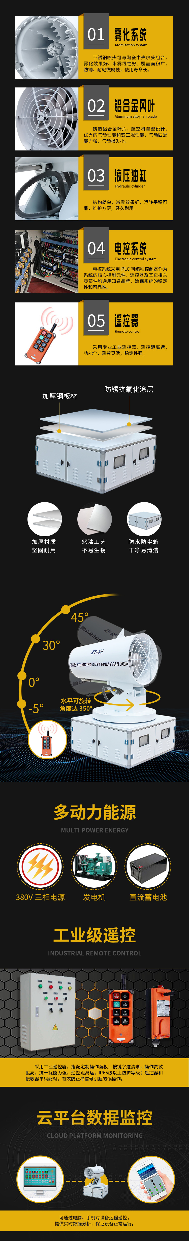 產品特點:50米固定式降塵霧炮機射程遠、覆蓋面積大,加速塵埃降沉,抑制塵埃擴散,結構可靠、運行穩定、作業效率高,遙控控制或全自動運行,靈活切換,啟動便捷。