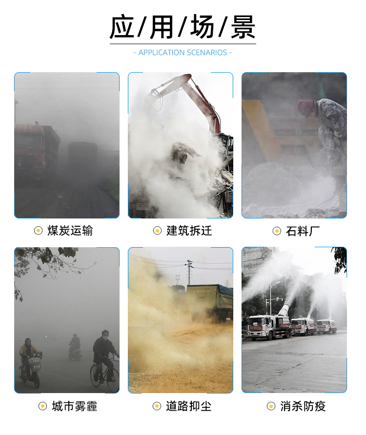 主要用途:用于煤礦場、城市拆遷工地、冶金鋼鐵企業(yè)、采礦區(qū)域、煤化工企業(yè)、水泥廠、火力發(fā)電廠、物料和礦產(chǎn)品露天堆放廠、混凝土處理廠、垃圾堆放場、垃圾焚燒廠、沙廠、干式物料倉庫、露天爆破、重度粉塵區(qū)域。