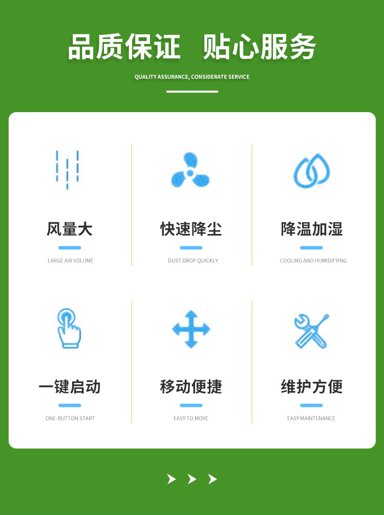 產(chǎn)品特點(diǎn):30米移動式噴霧風(fēng)機(jī)這款產(chǎn)品具有一鍵啟動功能,能起到快速降塵、降溫的作用;移動便捷,方便維修。