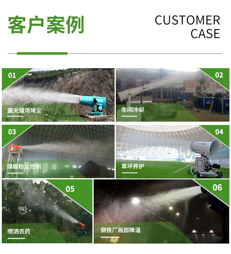 主要用途:適用于城市拆遷工地、冶金鋼鐵企業(yè)、采礦區(qū)域、煤化工企業(yè)、水泥廠、火力發(fā)電廠、建筑工地、物料和礦產(chǎn)品露天堆放廠、混凝土處理廠、垃圾堆放場、垃圾焚燒廠、沙廠、干式物料倉庫、露天爆破、重度粉塵區(qū)域。