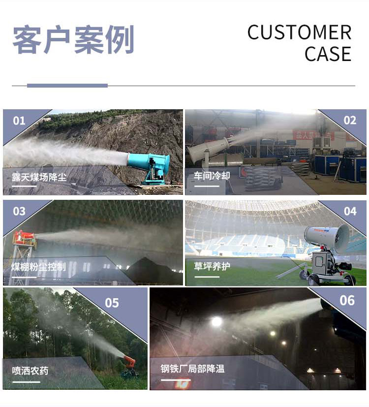 主要用途:適用于城市拆遷工地、冶金鋼鐵企業(yè)、采礦區(qū)域、煤化工企業(yè)、水泥廠、火力發(fā)電廠、建筑工地、物料和礦產(chǎn)品露天堆放廠、混凝土處理廠、垃圾堆放場、垃圾焚燒廠、沙廠、干式物料倉庫、露天爆破、重度粉塵區(qū)域。