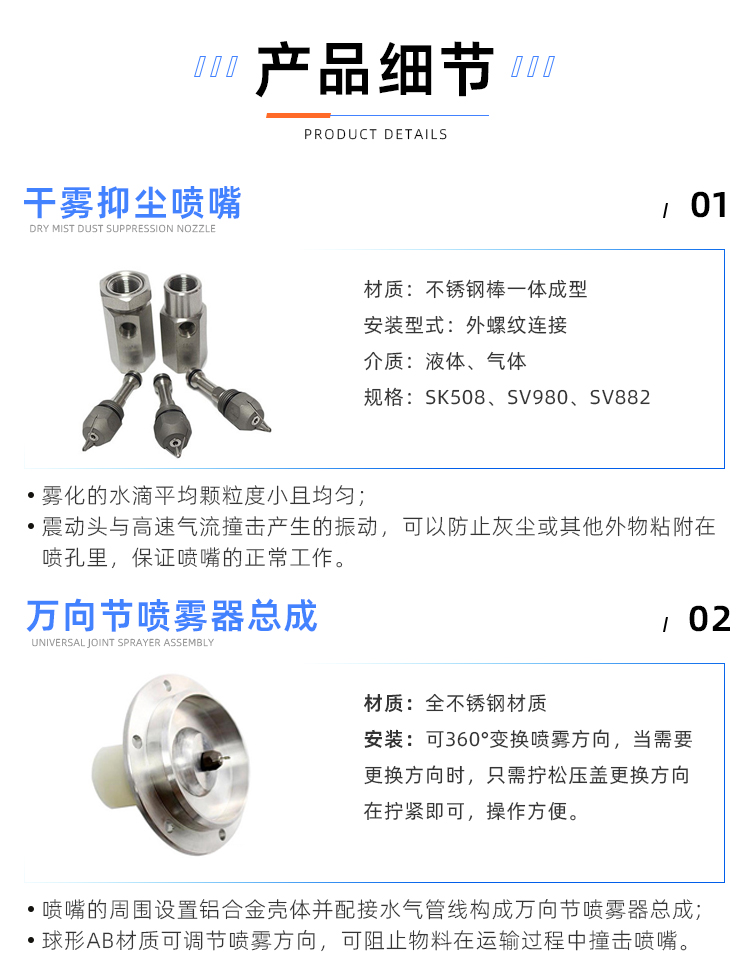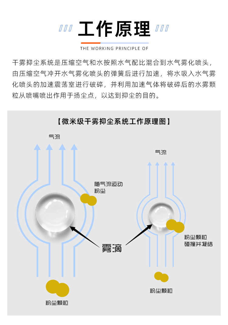 產品特點:干霧抑塵系統是壓縮空氣和水按照水氣配比混合到水氣霧化噴頭,由壓縮空氣沖開水氣霧化噴頭的彈簧后進行加速,將水吸入水氣霧化噴頭的加速震蕩室進行破碎,并利用加速氣體將破碎后的水霧顆粒從噴嘴噴出作用于揚塵點,以達到抑塵的目的。