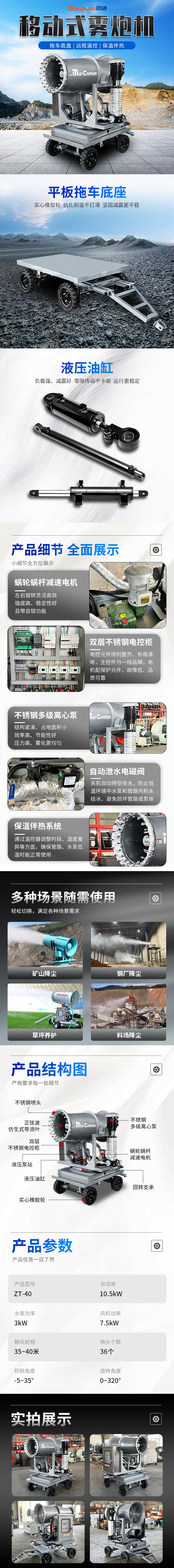產(chǎn)品特點:這款ZT-40型拖車式移動霧炮機,拖車底盤設(shè)計,移動便攜,噴霧范圍可隨意變換。由不銹鋼噴頭、不銹鋼多級離心泵、正弦波仿生式導(dǎo)流葉、雙層不銹鋼電控柜、蝸輪蝸桿減速電機、液壓泵站、液壓油缸、回轉(zhuǎn)支撐、實心橡膠輪等結(jié)構(gòu)制造。有手動,自動,遠程遙控,智能系統(tǒng)等操作方式,可適用于煤場,礦山,砂石料場,水泥廠,焦化廠,農(nóng)藥噴灑等場景的降溫除塵,噴霧打藥使用。15-150米射程,型號齊全,支持定制,有需要歡迎隨時聯(lián)系:徐經(jīng)理18703685880/17303712093(微信同號)