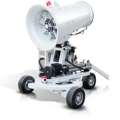 牽引式霧炮機的主要構成部分是由:機殼、進風口、出風口、電控柜、不銹鋼多級離心泵、液壓推桿、轉向系統、加強型槽鋼底盤、牽引拖架、實心防滑橡膠輪等。